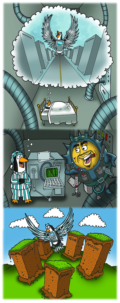 The last 10 years, every 6 month period has (without fail) resulted in an official OpenBSD release making it to the FTP servers. But CDs are also manufactured, which the project sells to continue our development goals. While tests of the release binaries are done by developers around the world, Theo and some developers from Calgary or Edmonton (such as Peter Valchev or Bob Beck) test that the discs are full of (only) correct code. Ty Semaka works for approximately two months to design and draw artwork that will fit the designated theme, and coordinates with his music buddies to write and record a song that also matches the theme. Then the discs and all the artwork gets delivered to the plant, so that they can be pressed in time for an official release date. This release, instead of bemoaning vendors or organizations that try to make our task of writing free software more difficult, we instead celebrate the 10 years that we have been given (so far) to write free software, express our themes in art, and the 5 years that we have made music with a group of talented musicians. OpenBSD developers have been torturing each other for years now with Humppa-style music, so this release our users get a taste of this too. Sometimes at hackathons you will hear the same songs being played on multiple laptops, out of sync. It is under such duress that much of our code gets written. We feel like Pufferix and Bobilix delivering The Three Discs of Freedom to those who want them whenever the need arises, then returning to celebrate the (unlocked) source tree with all the other developers. |